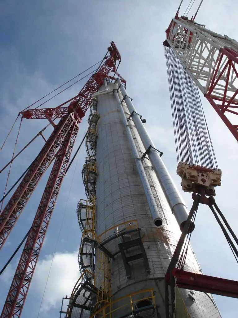 The MSG 80 ring crane, one of the largest in the world, is being used to lift a propylene propane splitter vessel. The vessel is in excess of 100m tall and weighs 1400mt