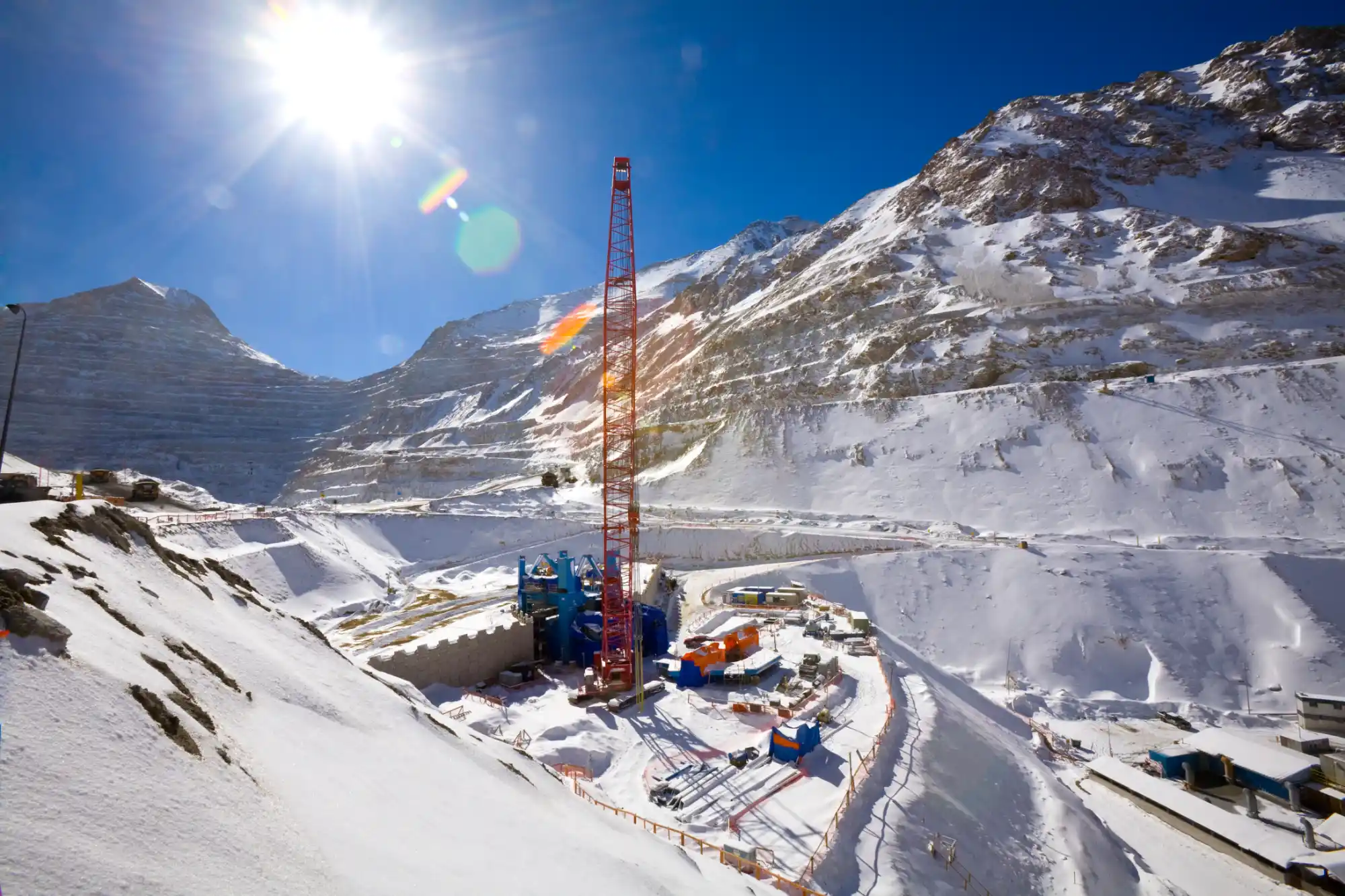 The paste tower under construction is seen from a distance with snow on the ground. The paste tower under construction is seen from a distance with snow on the ground.
