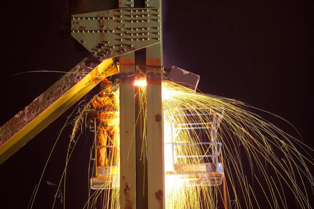 Aerial view of craft professionals conducting concrete work on bridge's cables.