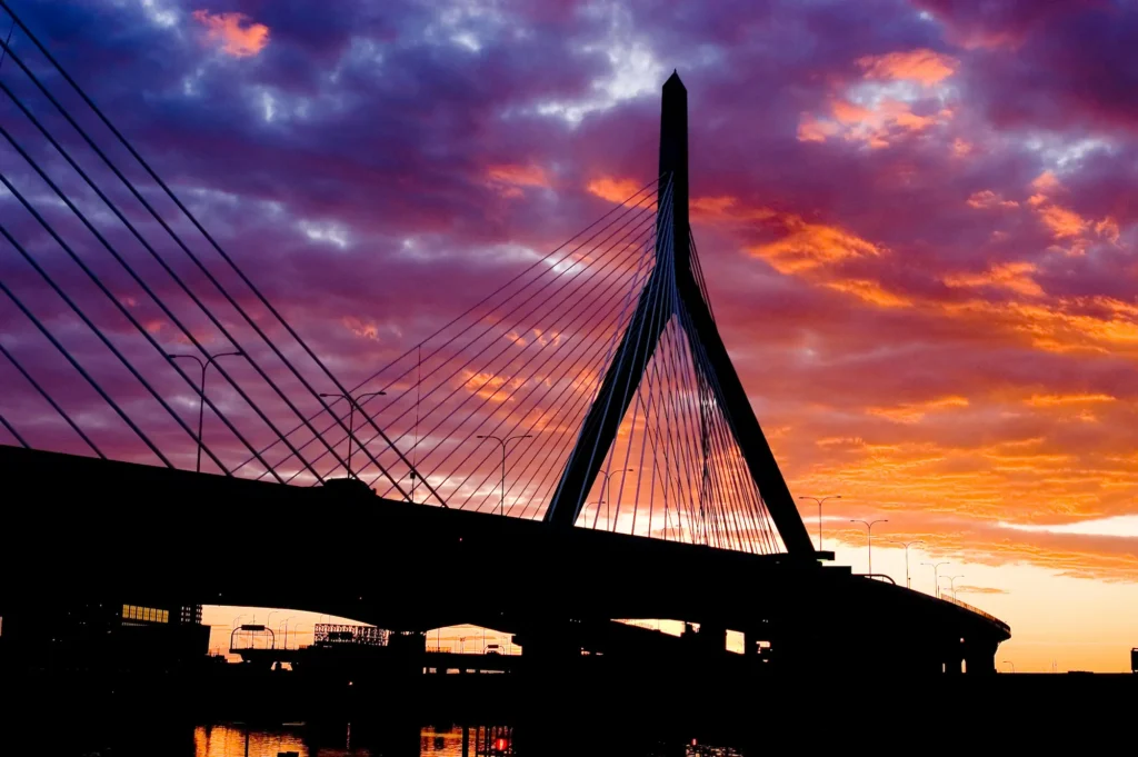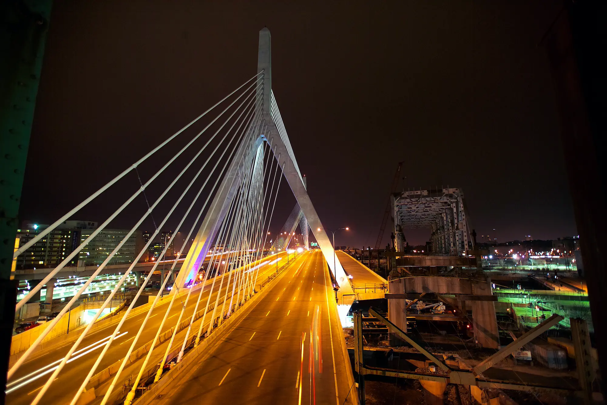 The bridge carries two outer lanes cantilevered on its east side. An additional eight lanes pass through the legs of the twin 300-foot (91-meter), obelisk-topped, inverted Y towers that echo the nearby Bunker Hill Monument. The bridge’s cables―which suggest a ship in full sail ―also evoke the history of East Boston as a center of shipbuilding. The bridge picks up Interstate 93 traffic as it emerges from the new Central Artery tunnel and carries it across the Charles River to point north.