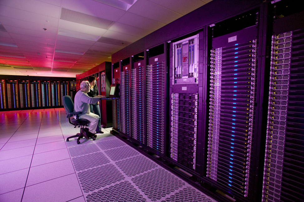 Room with banks (walls) of computers (Tri-Lab, Linux clusters, TLCC, Juno, Minos, high-performance, computing). Technician (scientist, male, man, professional) sits at computer. Female (technician, professional, woman) stands by. Red and violet lighting, technology, research, development.