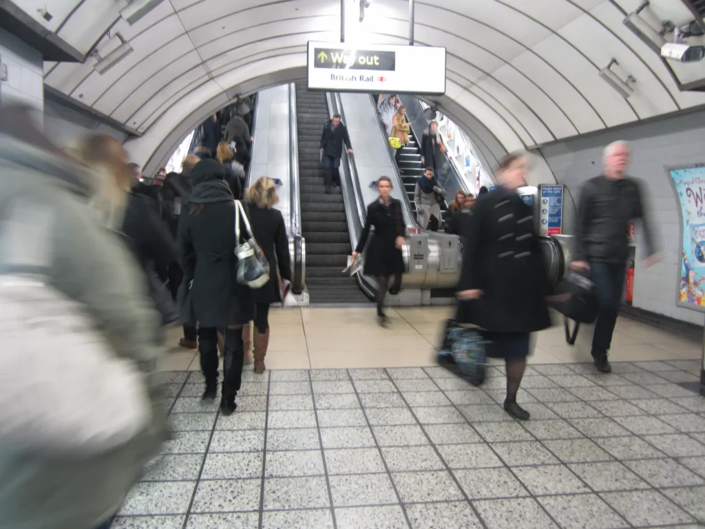 Commuters enter and exit the escalator in a tunnel at the Vauxhall underground station.