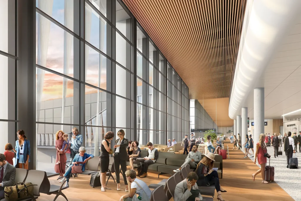 Rendering of passengers in the departure waiting area at the Western Sydney Airport.