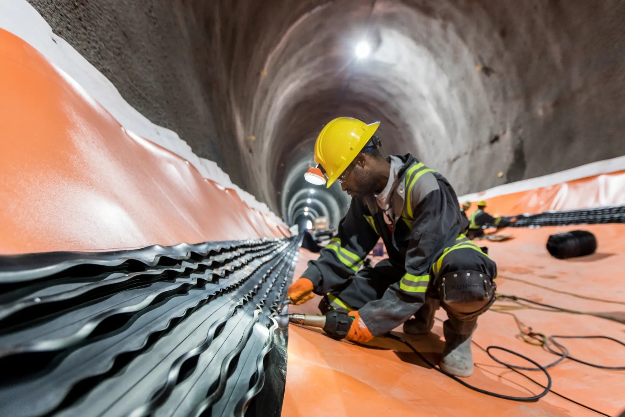 A TransEd worker installs waterproofing in the southbound tunnel in the North River Valley construction area.